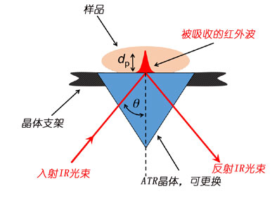 紅外光侵入樣品的深度與樣品的折射率n2、晶體的折射率n1、入射角θ、以及紅外波長λ 有關(guān),見下面的公式: