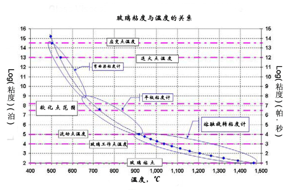 下圖是玻璃的粘度隨溫度變化的情況,顯示了我們對玻璃感興趣的軟化點、退火點和應變點,以及不同的測試高溫粘度計對應不同的粘度范圍。